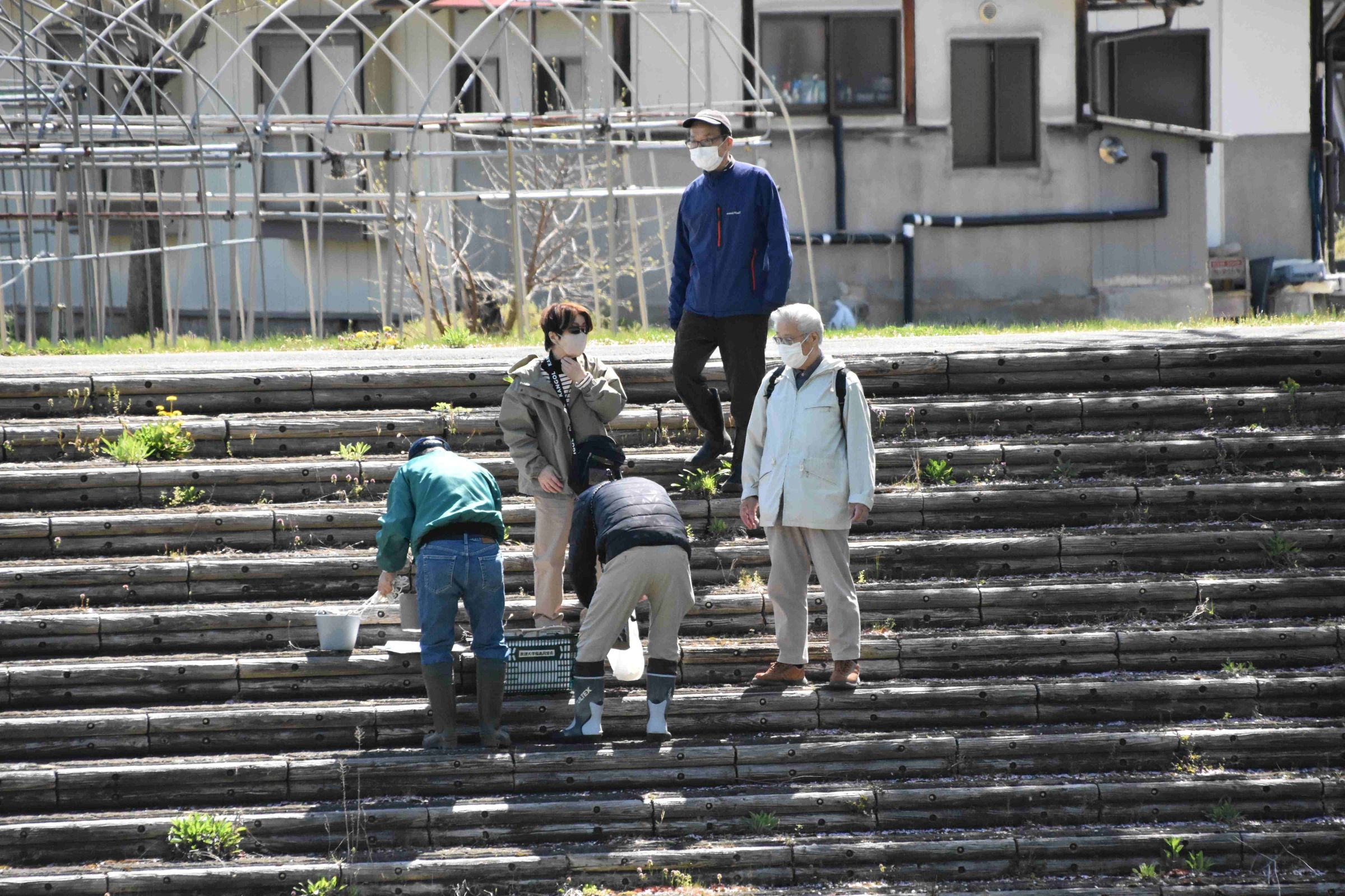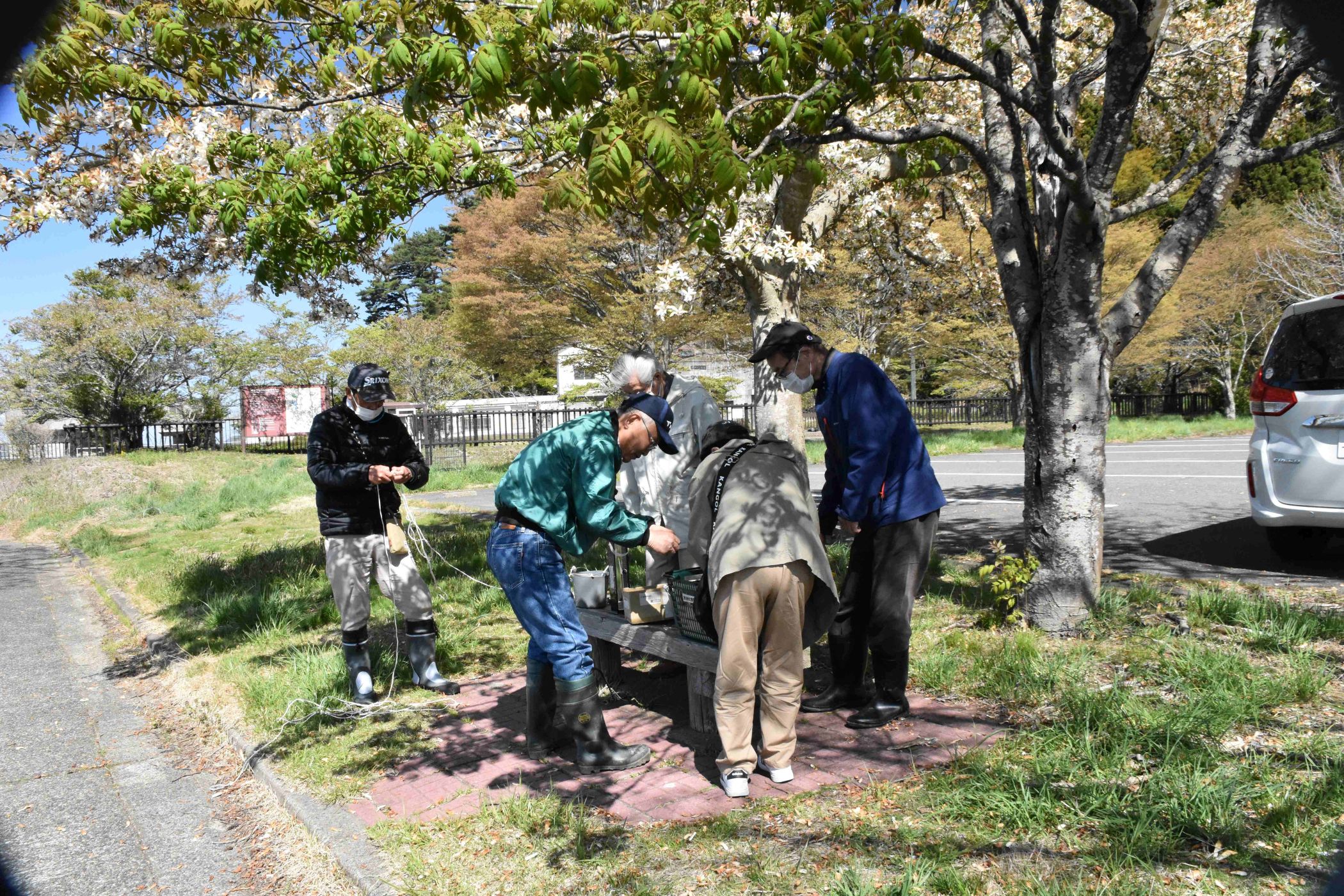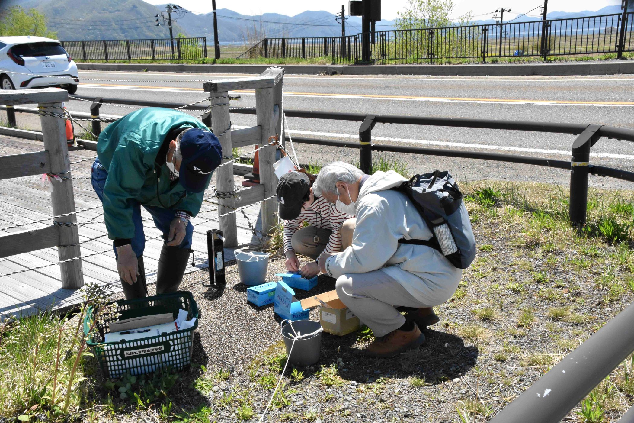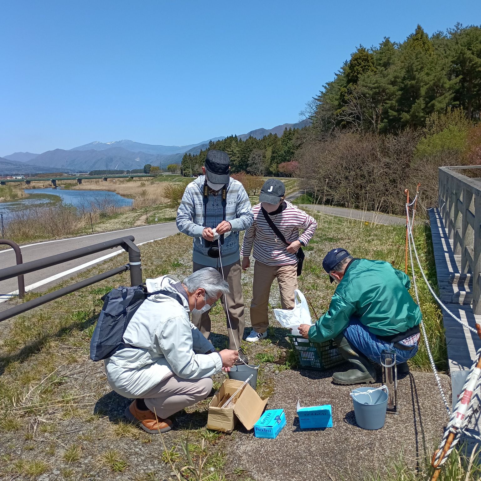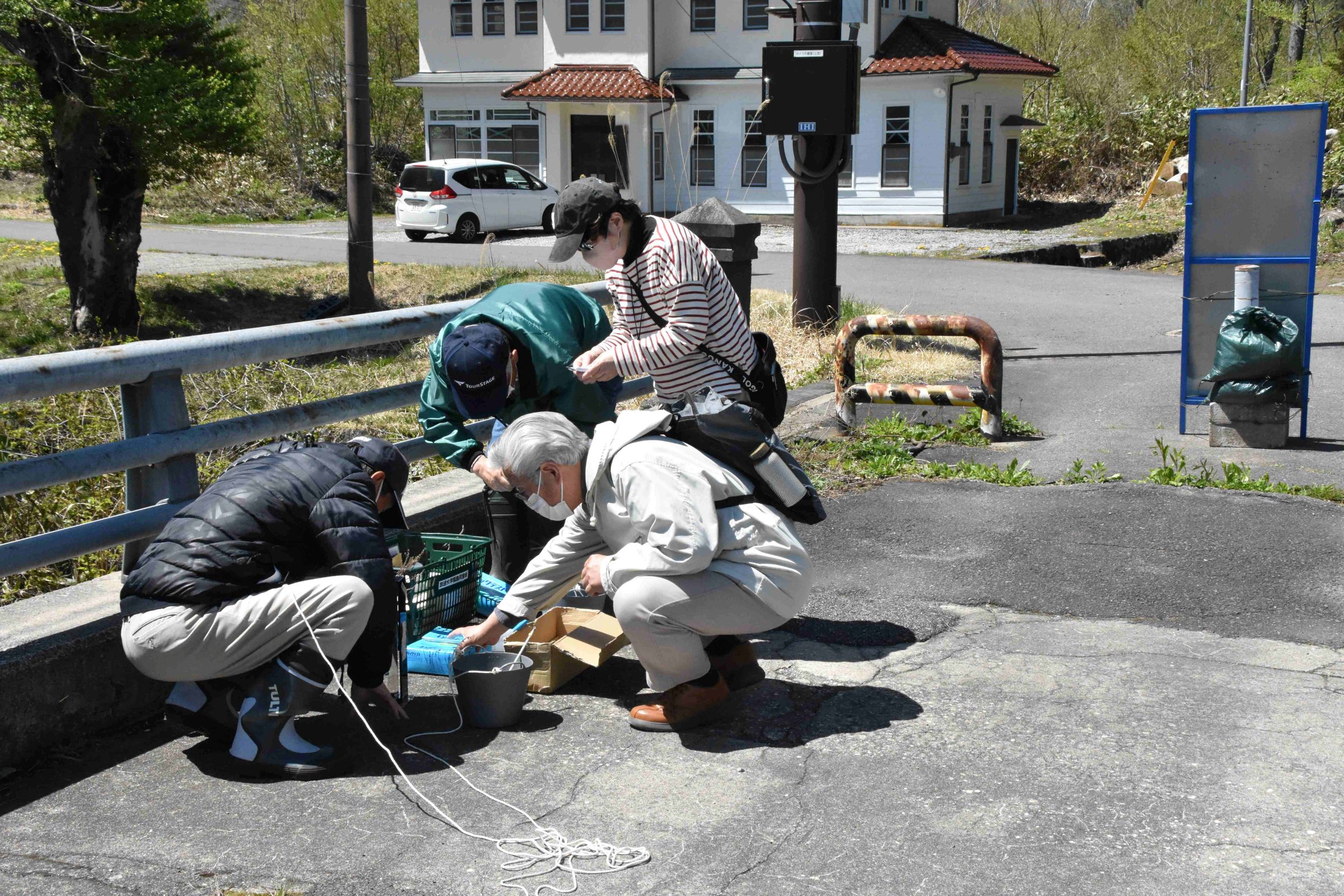 十六橋での水質測定。ここでも湖水水位の低下が確認できた。