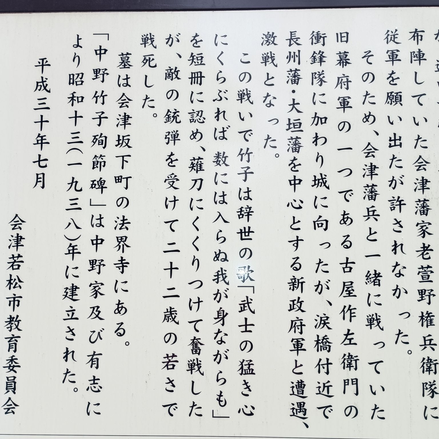8月25日、中野竹子を始めとする婦女隊が「涙橋」で新政府軍と交戦した。敵弾が飛び交う中で切り進むが、銃弾を頭に受けて戦死。敵に首級を与えることを潔しとしなかったので、母こう子と妹優子は敵を薙ぎ払って駆け寄り、涙を振るって竹子を介錯し、彼女の首を回収した。首級は後に母親こう子または農民の手により、会津坂下町の法界寺に埋葬された。享年20歳(諸説あり)