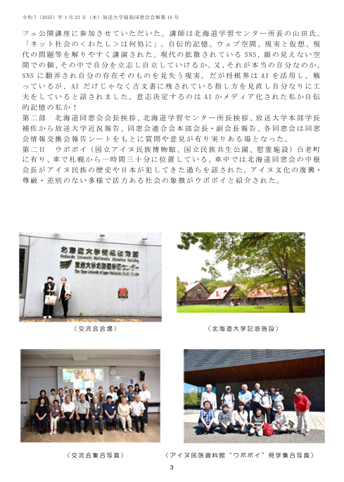 第一日 北海道同窓会の大内幹事の司会進行で始まり、第一部 アカデミックカフェ公開講座に参加させていただいた。講師は北海道学習センター所長の山田氏。「ネット社会の<わたし>は何処に」。自伝的記憶、ウェブ空間、現実と仮想、現代の問題等を解りやすく講演された。現代の拡散されているSNS、顔の見えない空間での個、その中で自分を立志し自立していけるか。又、それが本当の自分なのか。SNSに翻弄され自分の存在そのものを見失う現実。だが将棋界はAIを活用し、戦っているが、AIだけじゃなく古文書に残されている指し方を見直し自分なりに工夫をしていると話されました。意志決定するのはAIかメディア化された私か自伝的記憶の私か!