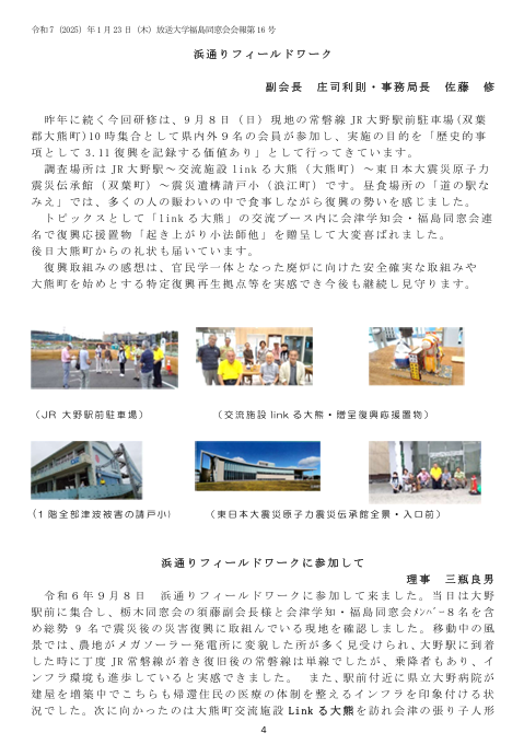 令和6年9月8日 浜通りフィールドワークに参加して来ました。当日は大野駅前に集合し、栃木同窓会の須藤副会長様と会津学知・福島同窓会メンバー8名を含め総勢9名で震災後の災害復興に取組んでいる現地を確認しました。移動中の風景では、農地がメガソーラー発電所に変貌した所が多く見受けられ、大野駅に到着した時に丁度JR常磐線が着き復旧後の常磐線は単線でしたが、乗降者もあり、インフラ環境も進歩していると実感できました。 また、駅前付近に県立大野病院が建屋を増築中でこちらも帰還住民の医療の体制を整えるインフラを印象付ける状況でした。次に向かったのは大熊町交流施設Linkる大熊を訪れ会津の張り子人形2体(起上り小法師、首振り飾り馬)を寄贈致し、放送大学同窓会として被災地に寄添っている事をお伝え致しました。 次に震災遺構の旧請戸小学校を訪問しました。校舎は東側を向いた2階建で、前には校庭が広がり、その延長先には太平洋が見えるといった震災以前は景観に恵まれた校舎だったと想像します。それが震災時には2階教室の床下迄津波に襲われその痕跡が展示してあり、威力のすごさには言葉を失う規模でした。しかし、幸いにも生徒全員が一人の犠牲者も出さずに地震発生から津波が来る約3〜40分の間に高台に逃げるとの認識で2Km離れた大平山迄徒歩で避難したとの事です。ここで重要な教訓、災害時は「自分の命は自分で守る」の徹底が、人命を守る事だと痛感しました。 -以上 三瓶(記)-