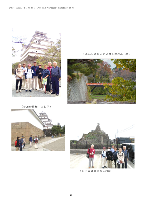 毎年恒例の歴史を楽しく学ぶ今回研修は「鶴ヶ城本丸と我国唯一現存する江戸時代から続く日本天文遺跡天文台跡(会津藩校日新館跡地)」を散策することとし10月6日(日)10時前に会津若松市にある県立博物館へ現地集合し8名の方が参加。