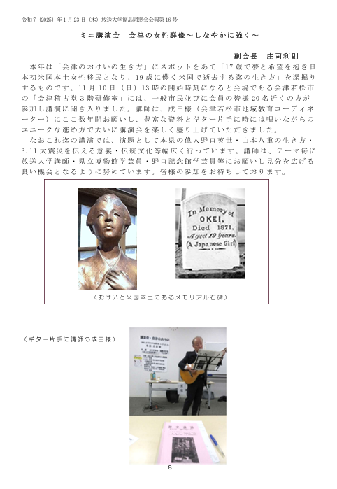 なおこれ迄の講演では、演題として本県の偉人野口英世・山本八重の生き方・3.11大震災を伝える意義・伝統文化等幅広く行っています。講師は、テーマ毎に放送大学講師・県立博物館学芸員・野口記念館学芸員等にお願いし見分を広げる良い機会となるように努めています。皆様の参加をお待ちしております。
