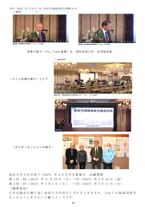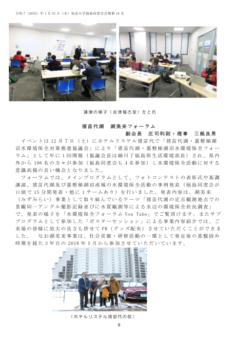フォーラムでは、メインプログラムとして、フォトコンテストの表彰式や基調講演、猪苗代湖及び裏磐梯湖沼流域の水環境保全活動の事例発表(福島同窓会が口頭で15分間発表・他に1チームあり)を行いました。発表内容は、湖美来(みずみらい)事業として取り組んでいるテーマ「猪苗代湖の定点観測地点での景観同一アングル撮影記録並びに水質観測等による水辺の環境保全状況調査」で、発表の様子を「水環境保全フォーラムYou